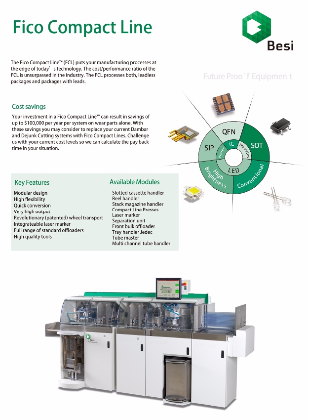 The Fico Compact LineTM (FCL) puts your manufacturing processes at the edge of today’s technology. The cost/performance ratio of the FCL is unsurpassed in the industry. The FCL processes both, leadless packages and packages with leads.